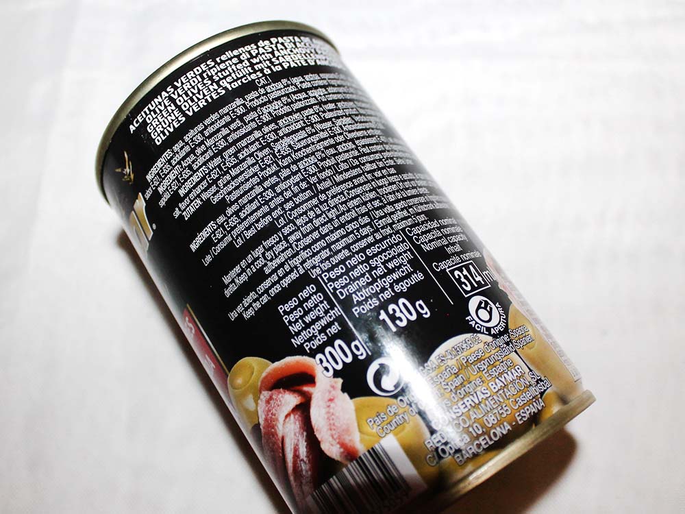 Ингридиенты: вода, оливки зеленые, паста из анчоусов 6% (анчоус, желеобразователь; альгинат натрия), соль, усилитель вкуса; глутамат натрия, подкислитель: лимонная кислота. % указаны на осушенной массе нетто.